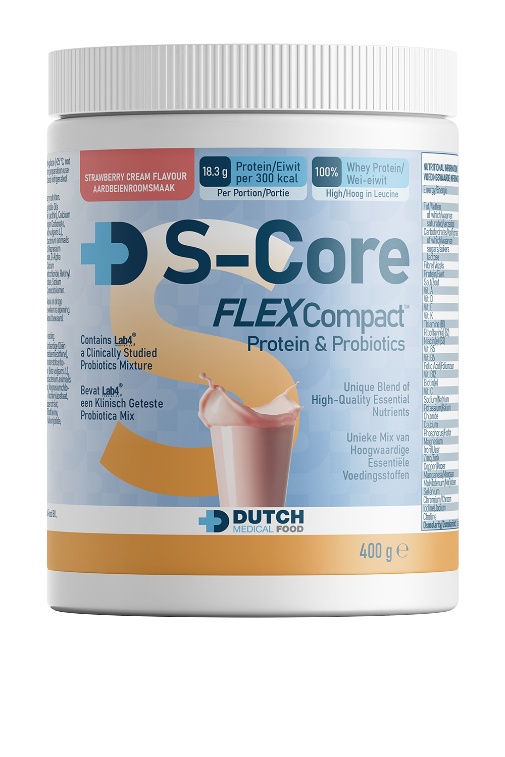 S-Core FLEXCompact™ Protein & Probiotics is een Voeding voor Medisch Gebruik en bevat hoogwaardige voedingsstoffen om voedingstekorten te voorkomen of aan te vullen. S-Core FLEXCompact™ Protein & Probiotics is speciaal ontworpen om een hoog gehalte aan eiwitten (29g/100g poeder) en een hoog gehalte aan essentiële vetzuren te leveren. Het product heeft verder een uitgebalanceerde mix van cruciale vitamines (bijv. vitamine D) en mineralen op basis van de nieuwste richtlijnen van de Europese Unie (EFSA, European Food Safety Authority).